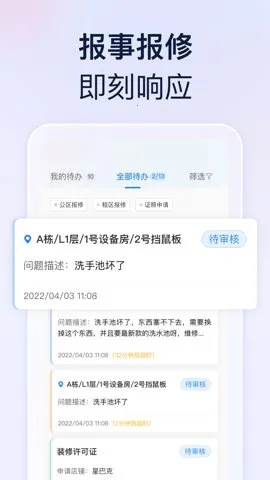 3. 功能全面:具备报事报修、计划任务、证照办理等功能。报事报修可即刻响应,计划任务让工作更轻松,证照办理能让复杂变简单,还提供工单管理、人员管理、物资管理、任务管理、报表分析等功能,全面提升物业工作效率。