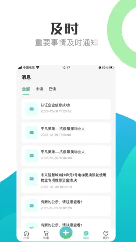 业主可在线查看小区活动信息、投票数据及重要通知等。物业缴费、查看通知、门禁对讲、社区通知、报修投诉等功能一应俱全。其特色显著,保修更快捷,提升了居民生活质量,能让用户及时掌握物业动态。费用账单明细且实时推送至手机端,方便一键查阅和缴费,还提供商城、二手市场、租赁服务、特约服务等。