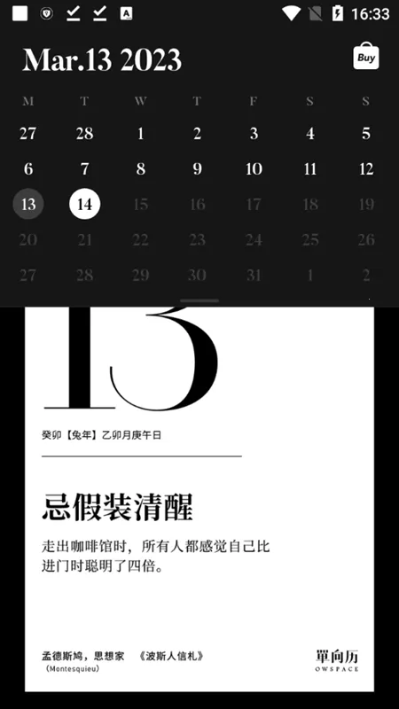 3. 文化内涵丰富:不光有阳历日期,还能看到各种中国传统日历习惯,每日推送一句名言警句或艺术作品摘录,内容涵盖书籍、电影、哲学等领域,能丰富用户精神世界,提升生活品味。