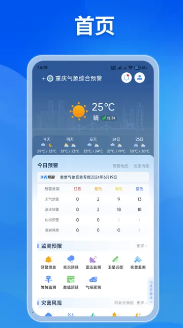 重庆综合预警专为本地居民打造。它能提供未来多天降雨量、雾霾指数、空气湿度等准确气象信息,展示天气预报实况、风险预警等,助用户应对气象灾害风险。