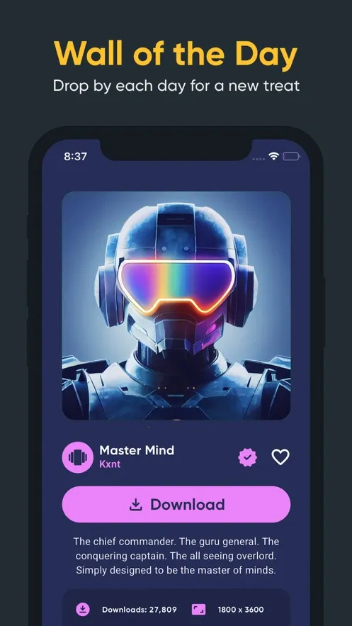 在功能方面,它具有探索筛选功能,有数百张团队手工制作的原创壁纸,且专为设备设计,独一无二。支持社交分享,用户可上传自己的作品,经审核后供社区使用,同时团队也会分享高质量公共领域照片。每日之墙展示新背景,带来新惊喜。还有高级收藏、收藏夹功能,可解锁奖励收藏,建立个人收藏并能跨设备同步。专业版能解锁更多功能,如无广告体验、保存探索壁纸等。
