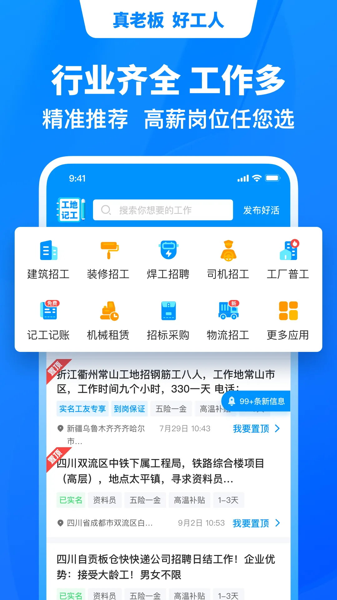 1. 功能丰富实用,不仅有招聘求职功能,还配备工地考勤及工人工资管理等工具,助施工方掌握项目进度与人工成本。