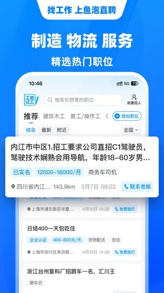鱼泡直聘是一款很靠谱的招聘求职平台。它专为求职者和企业搭建沟通桥梁,覆盖建筑装修、工厂制造、物流运输等多个行业,服务全国600余座城市。这里职位丰富,能满足各类求职者需求,不管是全职、兼职还是临时工,都有机会找到合适工作。