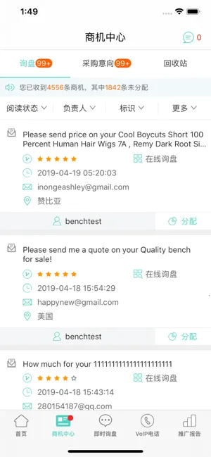 3. 操作功能丰富:具有一键分享功能,能把推广信息一键分享到社交平台再次推广;设有询盘中心,可查看APP询盘并进行分配;还有消息通知功能,收到询盘后实时提醒用户查看,使用起来高效便捷。