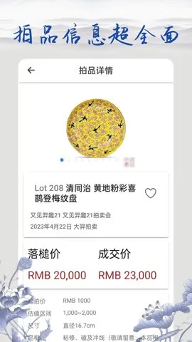 这款软件涵盖了丰富的陶瓷艺术品拍卖信息,包括珍稀古瓷和现代创意作品。用户能根据个人喜好在线浏览,及时参与感兴趣的拍卖。其瓷器资源丰富,按工艺、色彩、纹饰、年份、产地等分类展示,方便查找。