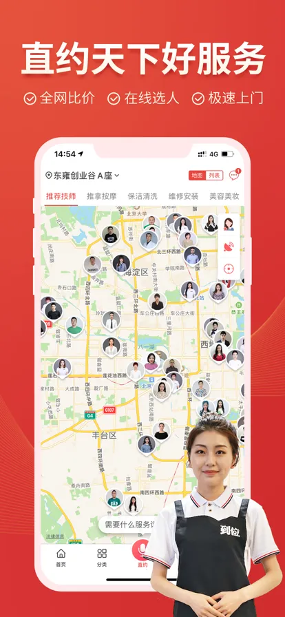 3、覆盖中国数百个城市,聚集各种类型商家,服务规范价格统一,为广泛地区用户提供丰富多样简单快捷的上门服务。