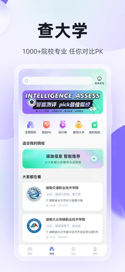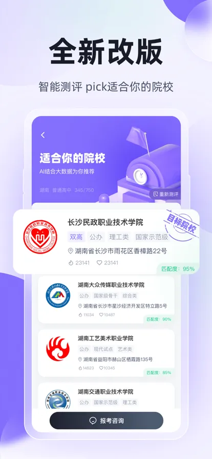 其院校专业库强大,覆盖全国高职单招院校,包括双高院校等,能提供院校介绍、招生简章等全方位信息,助考生快速选校。院校测评功能借助AI与大数据,可精准匹配适合的院校。