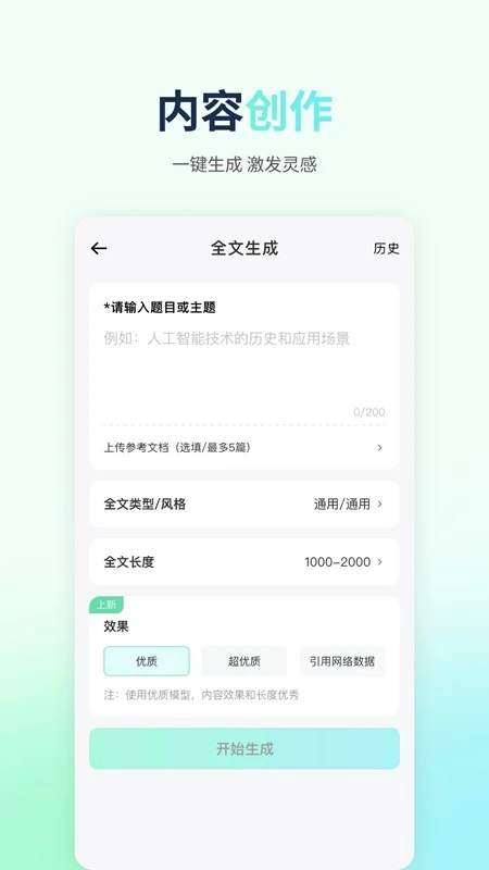 安装成功打开软件后,界面简洁直观,易于上手。它能满足多种写作场景需求。输入主题或简单描述,就能快速生成文本内容,且支持多种文风与用途选择。