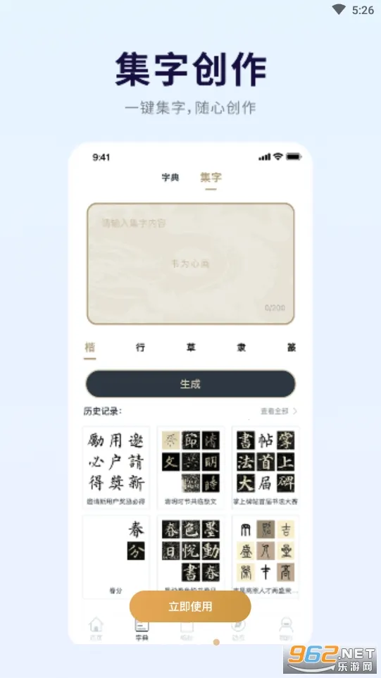 2. 功能实用多样:内置书法字典,收录超50万汉字字形;集字工具支持200字以内文本输入,一键统一书家书体风格;提供春联福字扇面条幅印章等多样创作模板,满足不同场景书写需求。