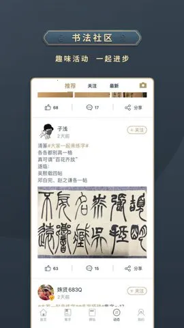 **社区互动交流**:社区为书法爱好者提供了交流探讨的空间,促进用户间的学习与互动,增强陪伴感。其界面设计简洁清晰,功能分类明确,易于上手,是书法学习的得力工具。