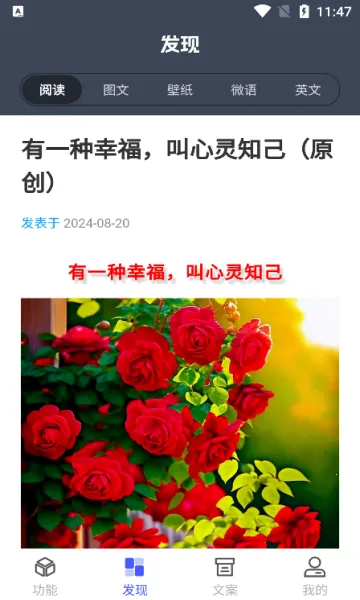 进入主页,有丰富的图片工具和压缩工具等,能满足多样需求。发现板块提供优质阅读图文壁纸等资源,文案馆有不错的资源可复制。我的模块能每日签到和进行应用设置。