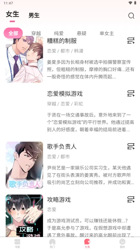 1. 海量资源:拥有海量热门免费漫画以及未被发掘的宝藏纯爱佳作,涵盖真人纯爱同人、日漫、韩漫等多种类型,题材极其丰富多样,像日韩少女、热血动作、悬疑惊悚、科幻耽美等各类题材应有尽有,能满足不同用户的口味。