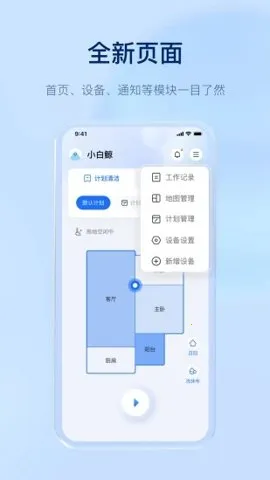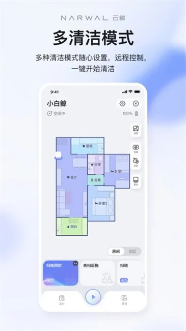云鲸智能app由云鲸智能科技东莞有限公司研发,用于提升云鲸拖扫一体机器人体验。可远程操控,自定义清扫方案,设置禁区,查看工作状态和路径,还能在线储存查看视频、与家人聊天、分享照片等。