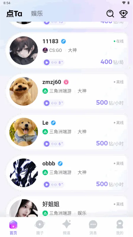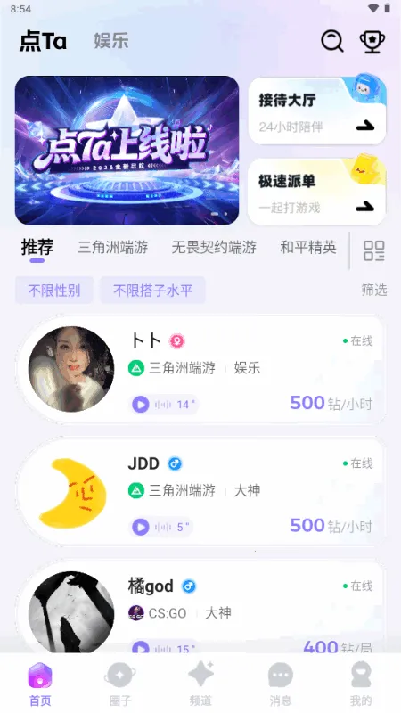 点Ta安卓版是专为游戏玩家和社交爱好者打造的陪练陪玩软件。有专业电竞搭子、娱乐陪玩,覆盖多热门游戏。还有24小时Live驻唱、海量播客,支持配音交友等,功能丰富,体验轻盈高效。