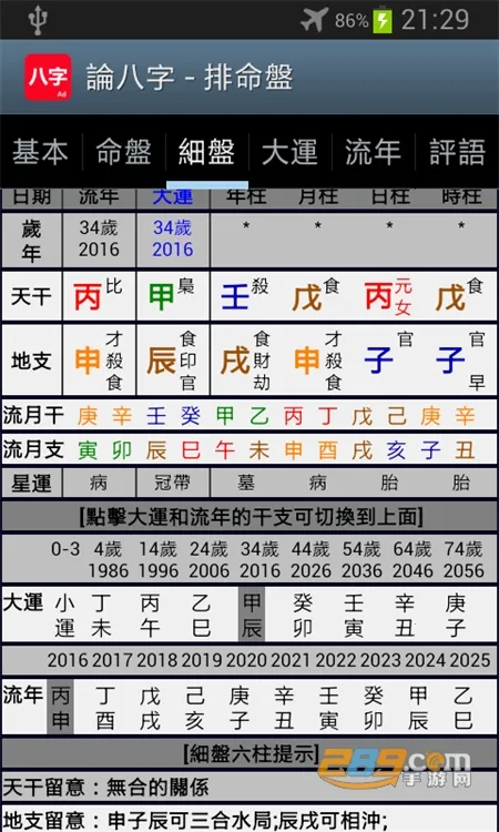 2、操作简单便捷,界面简洁,只需先保证生日数据正确,再从首页点击列表里的星盘功能,通过星盘页面底端就能快速找到八字功能,软件会依设置生日给出相应数据。