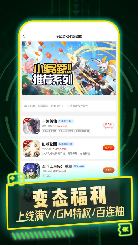 1、折扣力度大:真实0.1折体验,无限次数享受超低折扣,全场游戏0.1折起,部分商品长期维持低价,重氪游戏账号、游戏内限时道具、月卡周卡等最高都支持1折折扣,大大降低玩家氪金消耗。