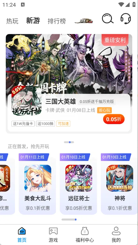 **1折游戏盒**是一款主打折扣福利游戏的手游盒子软件。它汇集大量优质游戏资源,涵盖三国冒险、射击等多种类型,更新速度快,能满足不同玩家喜好。