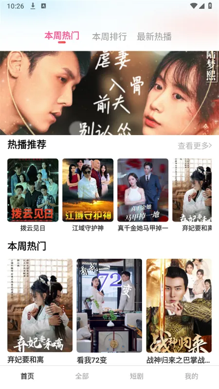 它还具备诸多贴心功能。能自由切换播放清晰度,根据网络状况快速调整。可直接下载缓存影视,随时想看就看。进入app,能发掘各种题材短剧的创意。而且分类详细,爱情、逆袭等多种系列一目了然,还有热播榜,轻松解决剧荒问题。整个软件设计简洁,用户体验友好,无广告干扰,查找和播放剧集方便快捷,是一款值得下载安装的短剧播放软件。