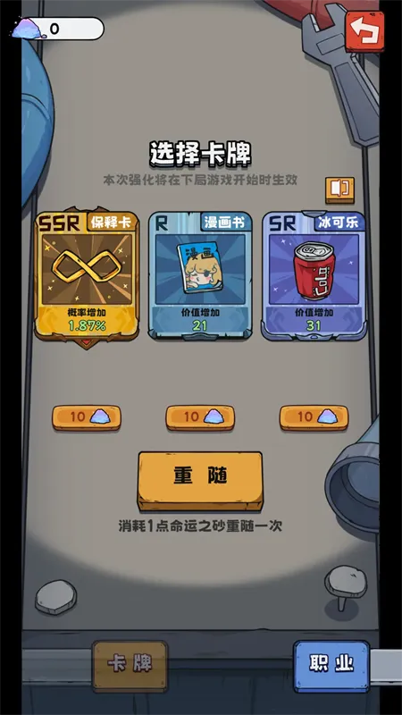 玩法上,选身份和天赋后开始游戏,要在100天内抽到100张SSR卡才能出狱,抽卡用金币,每天更新。点击十抽获取卡牌,没抽到SSR可去放风时在交易市场交换。卡库选四张与对方交换,满意成交,不满意重随。同时要关注身体状态,拖卡牌恢复属性。