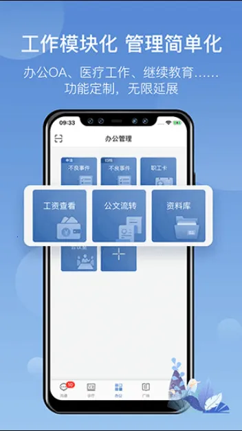 3. 工作模块化管理简单化,还具备办公OA、医疗工作继续教育等功能定制,可无限延展,满足多样需求。
