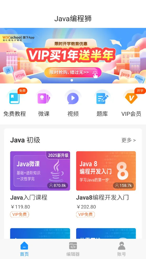 Java编程狮是W3Cschool编程狮旗下的Java入门工具App,覆盖少儿与成人编程学习。有海量免费教程、Java题库,支持在线编译。通过微课即学即练,采用游戏化闯关设计,适配碎片化时间,助初学者轻松入门编程。