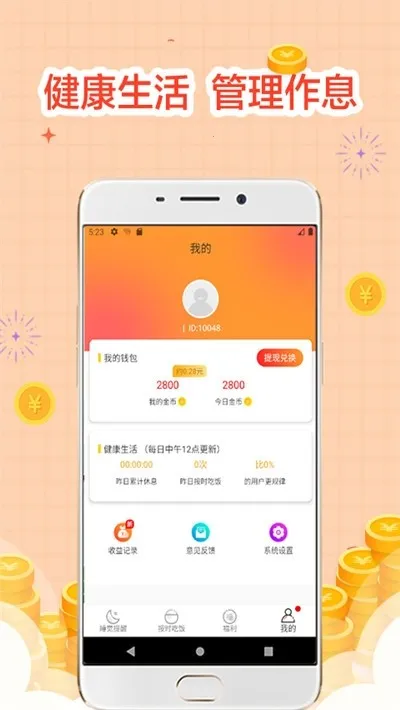 软件界面设计清晰,活动简单明了。每天12点更新金币收益,支持微信提现。完成新手任务、邀请好友等都能得奖励。其特色在于微信登录方便转钱,还能帮用户养成按时睡觉、吃饭的习惯,提升生活健康水平。