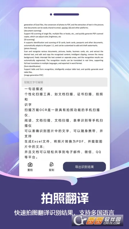 2. 功能丰富用途广:支持扫描文本、图片转PDF、表格识别、证件扫描等多项功能,还能进行文字识别、翻译,满足办公、学习、出行等多种需求。