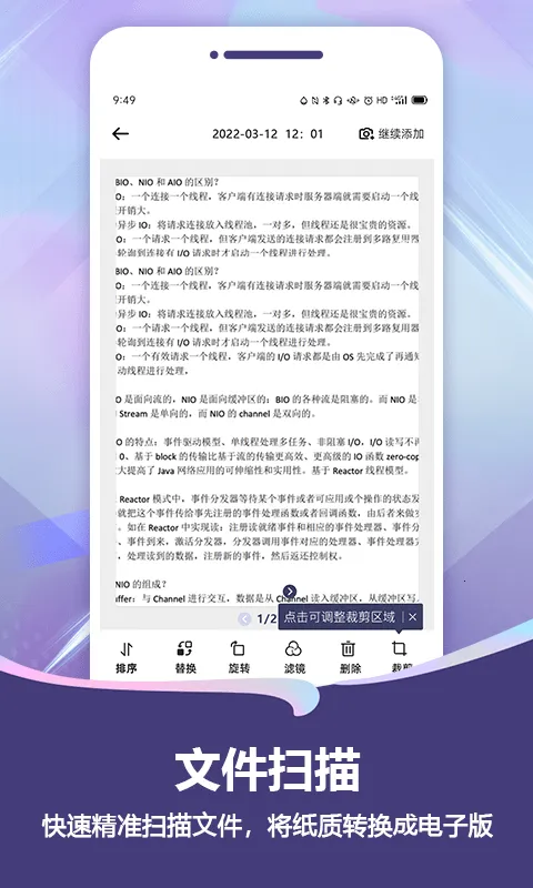 扫描Pro是一款超实用的PDF扫描与文字识别工具。它功能强大,能帮你高效处理各种文档。智能文字识别可自动识别扫描文本并转为可编辑内容,轻松应对各类文档。支持扫描证件、书籍、文章、表格等,快速生成高质量扫描文件。还能一键将图片转成标准PDF文件,方便存储与分享。内置多语言识别与翻译功能,涵盖法语、德语、俄语等多种语言,助力跨语言交流。