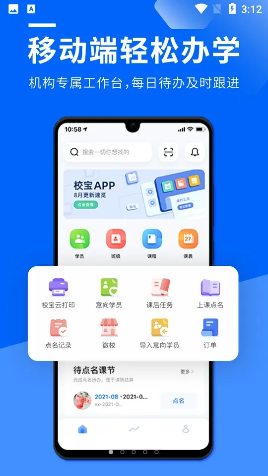 校宝安卓版是为教培机构量身打造的信息化管理平台,功能涵盖多渠道招生引流、智能化教务管理、精准家校互联等,支持数据可视化分析,能提升管理效率、优化服务质量,助力机构应对教育信息化挑战。