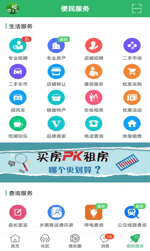 镇雄微生活是一款超棒的本地综合性服务平台。它整合了生活服务、人才招聘、特色美食、房屋租售、同城交友等各类信息。在这里,你能轻松获取全镇雄最新消息。不管是本地热点新闻,还是生活缴费、公交查询、快递查询、天气查询等便民信息,都能一键搞定。它就像你的生活小助手,吃饭购物旅游结婚买房装修等精选活动,一网打尽,为你提供全面的生活消费经验分享。同城交友功能也很有趣,能帮你告别城市的冷漠,邂逅有缘人。而且微友圈能让镇雄人相互分享交流,还有家乡人的兴趣部落,能创建属于自己的圈子,结交志趣相投的朋友。有了镇雄微生活,全镇雄的新鲜事都在你掌握之中,生活更加便捷美好,赶紧来下载体验吧!