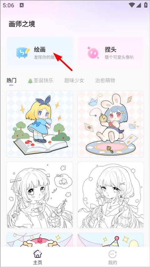 1、用户打开画师之境app,登录进入主页,主页中有各种热门、治愈、甜味素材,用户可选择喜欢的进行涂色,点击左上角绘画;