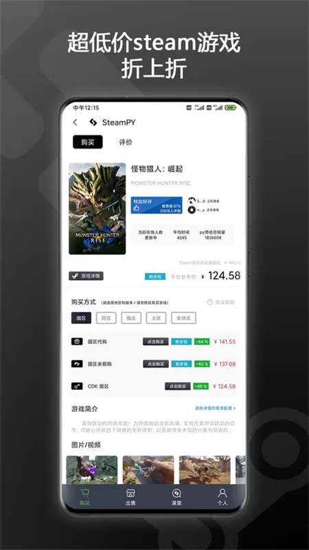 SteamPY最新手机版是为Steam玩家打造的交易平台,提供安全快捷的游戏交易体验。能超低价购游戏、CDkey等,有自主研发聊天系统保障交易安全,还有丰富资讯,商品发布简单,特卖商品折扣低至1折。