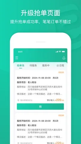 软件功能强大,四步即可完成认证,入驻后能获得海量实时更新订单。在线管理订单时,可掌握护理进度与完成状况。还提供录音工具,避免医患纠纷。此外,多种保险保障医护人员权益,订单种类丰富。总体而言,该版本功能贴合医护需求,能切实解决实际问题,是医护人员不错的选择。