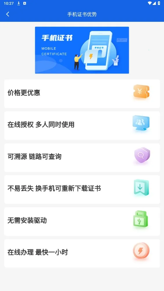 2. 办理超便捷:企业无需现场申请数字证书,下载手机APP即可在线完成流程,在线申请CA数字证书手机版,交易平台兼容传统媒体版和手机版,并行不冲突。