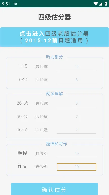 四级估分器 2026 官方正版,专为大学生英语备考打造。它高度贴合大学英语四六级考试官方要求,四大核心模块全面覆盖,内容严谨,全真模拟考场情境。