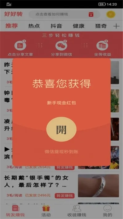 好好赚2026官方最新版本在内容与体验上有诸多亮点。文章资源丰富多样,涵盖新闻、养生、搞笑、娱乐等领域,能满足不同用户的阅读兴趣。用户分享优质文章可领红包,边阅读边赚钱,趣味性十足。
