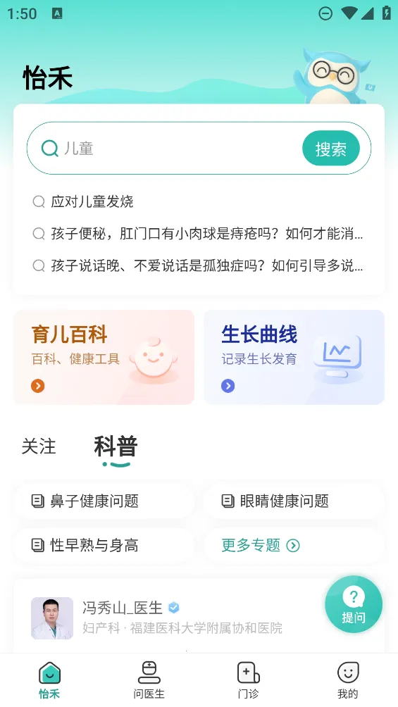 该软件汇聚众多权威医师,用户能随时随地线上问诊,获取专业解答。其免费提问的怡禾星球,有医生、药师、营养师等专业人员审核回答各类问题,还有丰富科普文和咨询案例。怡禾生长曲线可记录0到12岁宝宝生长情况,采用更适合中国宝宝的中国九城数据维度,界面操作流畅,能预警发育迟缓、预测遗传身高。育儿百科涵盖0到3岁宝宝各发育阶段知识点。此外,还提供预约门诊服务,在多地设有门诊,涵盖多个科室。