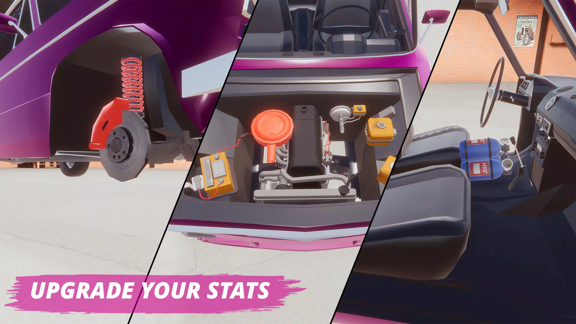 玩家可在车库中从头打造梦想之车,拿起工具组装发动机到车身的每个部件,还能安装升级活塞等零件,调整悬架、外倾角、偏移和轮胎,影响汽车实际性能,享受注重细节的逼真3D机械体验。