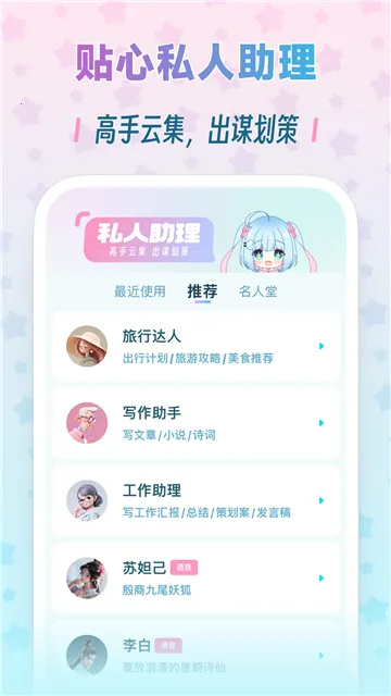 在互动方面,支持与桌宠进行喂食、玩耍、聊天等操作,还能和各大虚拟历史名人对话交流。输入问题就能收到答案,在私人助理界面点击写作助手,输入创作主题,能获得结构建议、文笔润色或内容扩写等创作辅助。