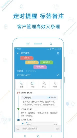 软件亮点众多。智能回访可设闹铃,确保客户无一漏访。智能备注能全面记录客户信息。业界交流提供分享行业经验的平台。智能标记有多种快捷按钮。拨打统计让工作情况一目了然。