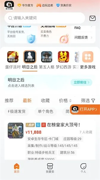 软件特色也很突出,支持便捷搜索,输入关键词就能找道具。交易订单可储存,方便随时浏览。适配性良好,各品牌手机都能完美运行。卖号流程简便,点击选择游戏、扫描角色、一键上架,无需游戏截图和填账号密码,数据转移出售更安全,等待收款即可。新人用户有详细交易指南,注册并完成实名信息认证就能解锁交易功能,是一款不错的游戏道具交易平台。