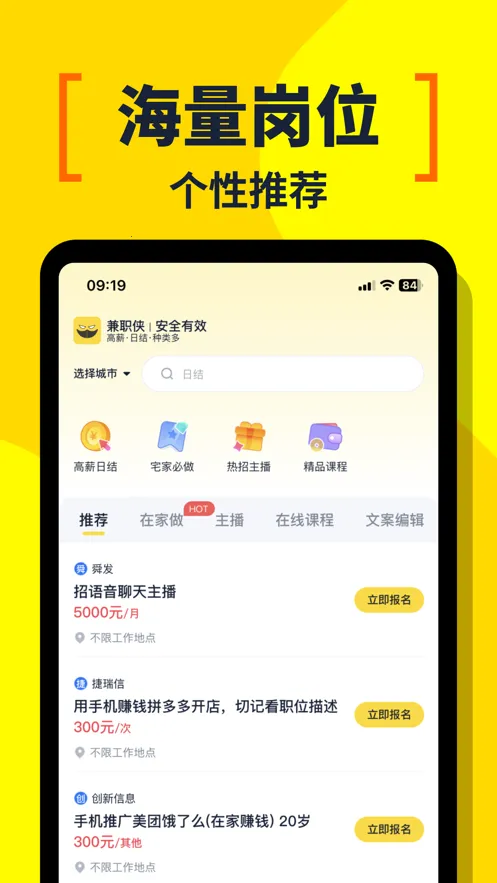 兼职侠2026是杭州弧途科技打造的手机兼职软件,为学生、宝妈、自由职业者等群体服务。有海量真实岗位,涵盖多行业,信息保障真实,申请便捷,支持日结,还有智能推荐等功能,助您轻松兼职赚钱。