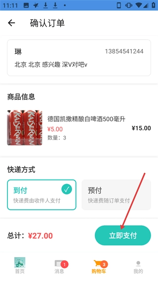 在【确认订单】页面仔细核对【德国凯撒精酿白啤酒500毫升】的相关信息,以及【到付】的支付方式无误后,点击【立即支付】按钮,即可完成该订单的支付流程。