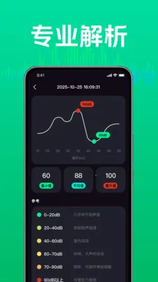 日常噪音检测助手2026官方正版支持实时噪音检测,直观显示分贝数值,记录最值与均值,有专业解析、拍照检测功能,提供测试日记与历史记录,能助力环境监测、噪音维权及健康防护,新版已修复问题提升体验