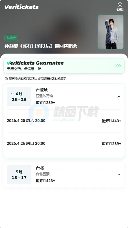 Veritickets是专注跨境演出与体育赛事的票务平台,是全球演唱会体育赛事票务专家。覆盖热门赛事与演唱会,解决抢票、票源真伪、跨境支付等痛点,功能多,能提供安全透明的购票服务。