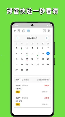 3. 取件日历可视化日历视图,直观展示每日快递状态,已签收、待签收一目了然,轻松追溯取件记录,防止遗漏。