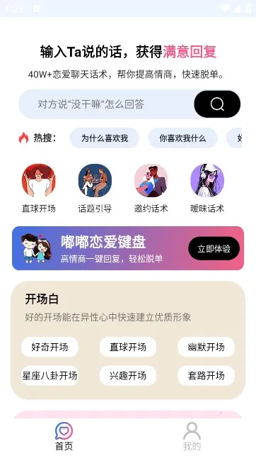 嘟嘟恋爱话术最新手机版是一款专注恋爱聊天辅助的工具。它提供海量恋爱话术资源,覆盖恋爱全场景,满足不同阶段需求。多样回复风格适配不同场景,让表达更自然。核心回复功能一键生成贴合回复,悬浮球快捷切换输入法,操作高效。轻量实用设计,专注表达辅助,不做过度干预。还有导师帮回服务,解决恋爱聊天难题。能助力用户提升情商,轻松与异性聊天互动,是恋爱沟通的得力助手。