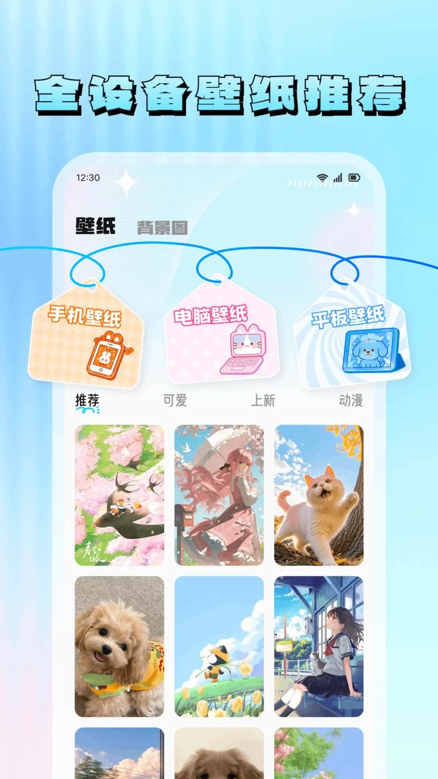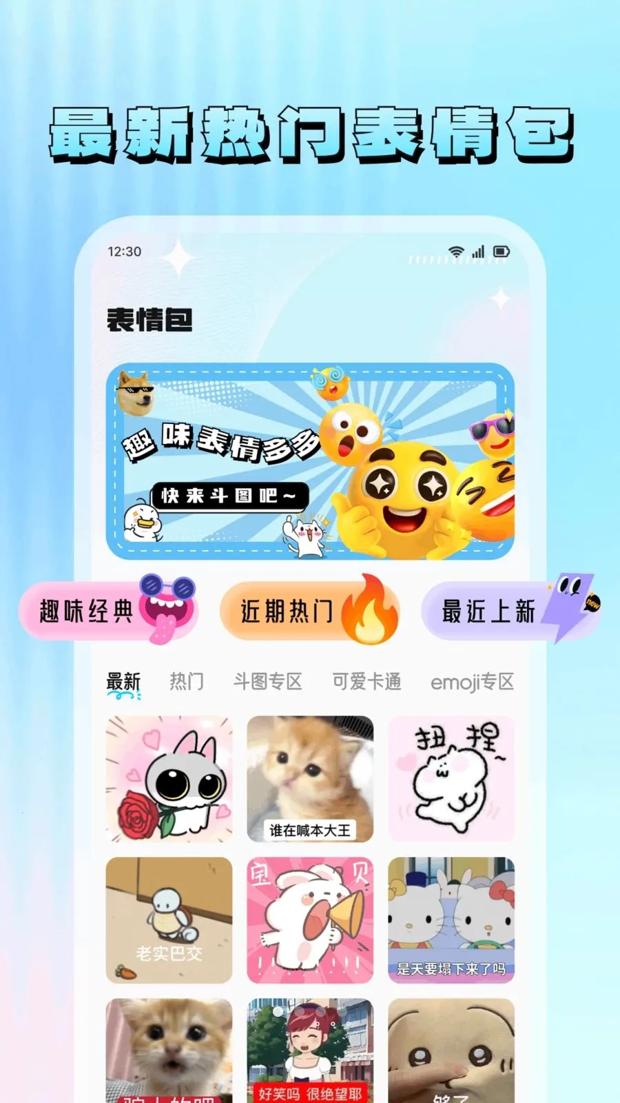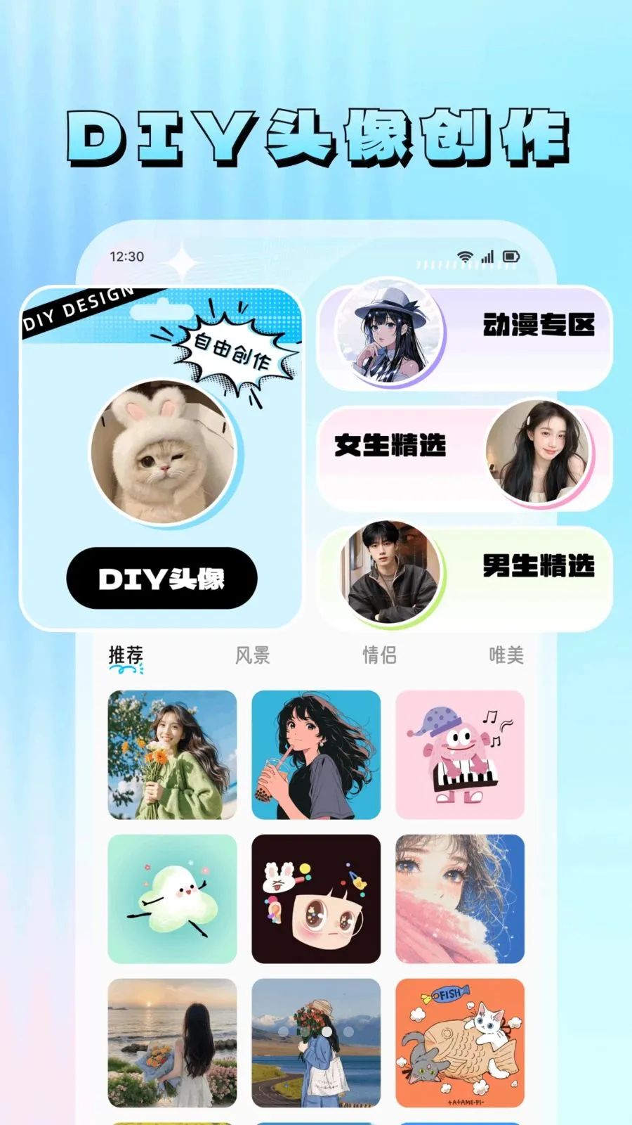 2. 资源丰富多样:拥有海量热门表情包,风格齐全的全设备高清壁纸,涵盖动漫萌宠等多种风格,还有高清无水印的DIY专属头像图库,自由创作空间大,能充分展现个性。