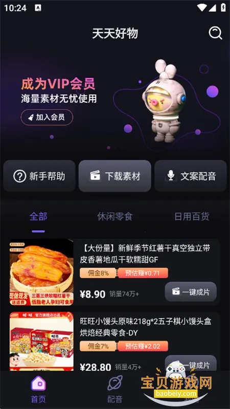 天天好物2026官方正版每天更新原创高清视频,涵盖零食日用百货等,有高清实拍剪辑教学全案运营。视频经智能处理独一无二,一键可发抖音快手。新版新增AI带货视频功能,还优化了用户体验。