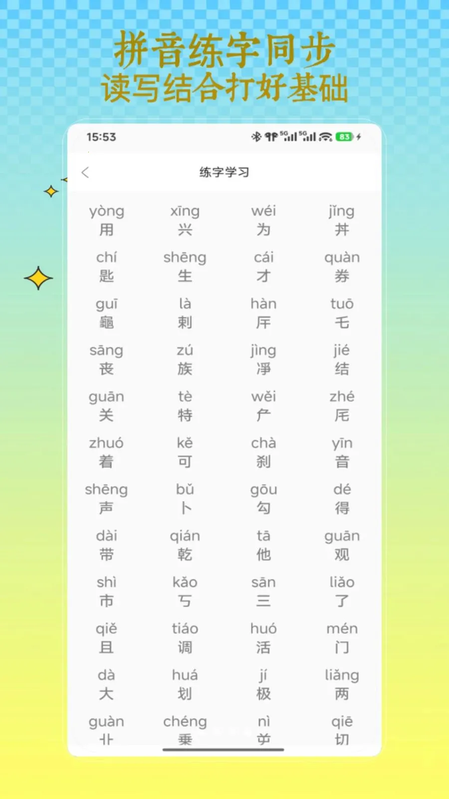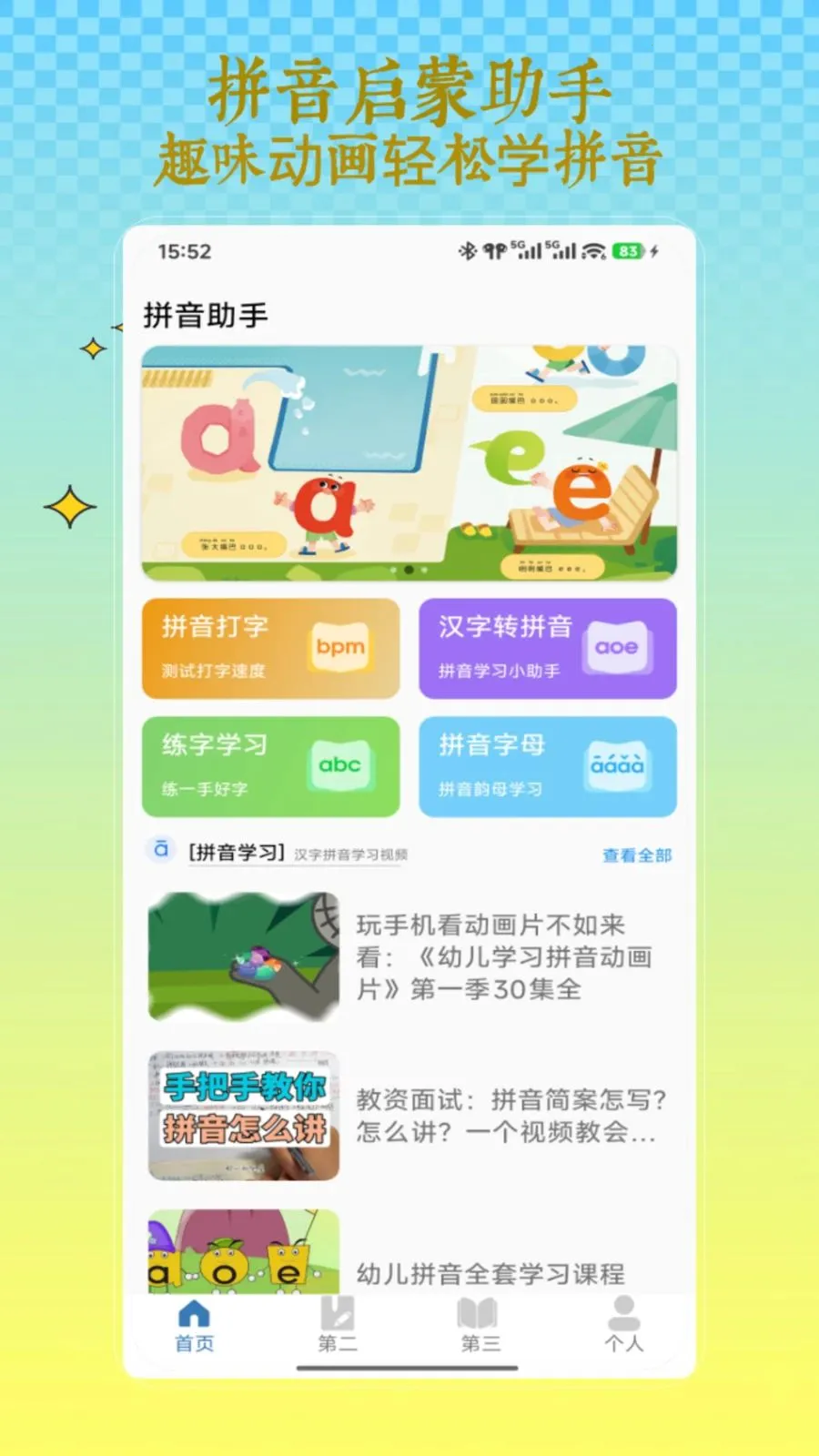 拼音发音2026官方正版是一款优秀的汉语拼音学习软件,适用于幼儿园及打字等拼音学习。卡通UI界面,助孩子轻松吸收知识,短时间掌握拼音,全新应用首发,助力孩子爱学且学有成效。
